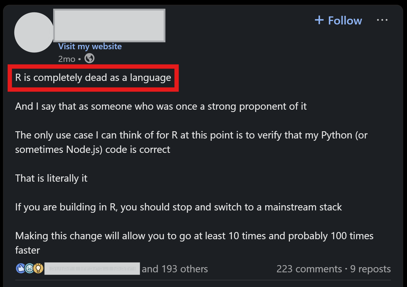 Amost everything that used to make Python awesome that wasn’t in R has been since ported over to R.